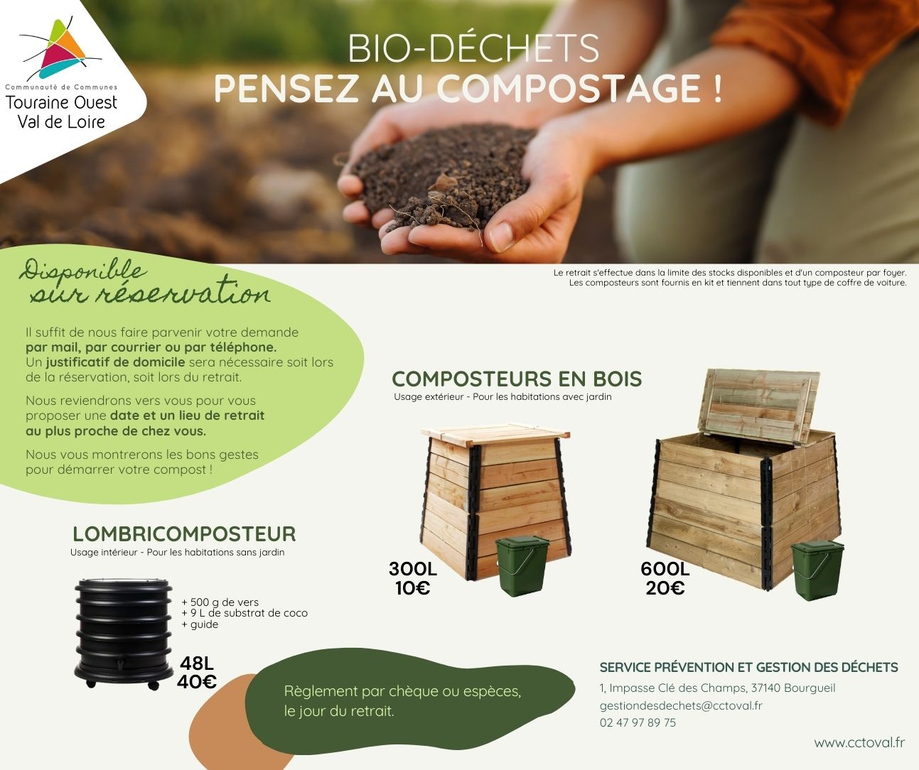 Par mail, courrier ou téléphone à la CCTOVAL, un justificatif de domicile sera nécessaire, règlement le jour du retrait.
