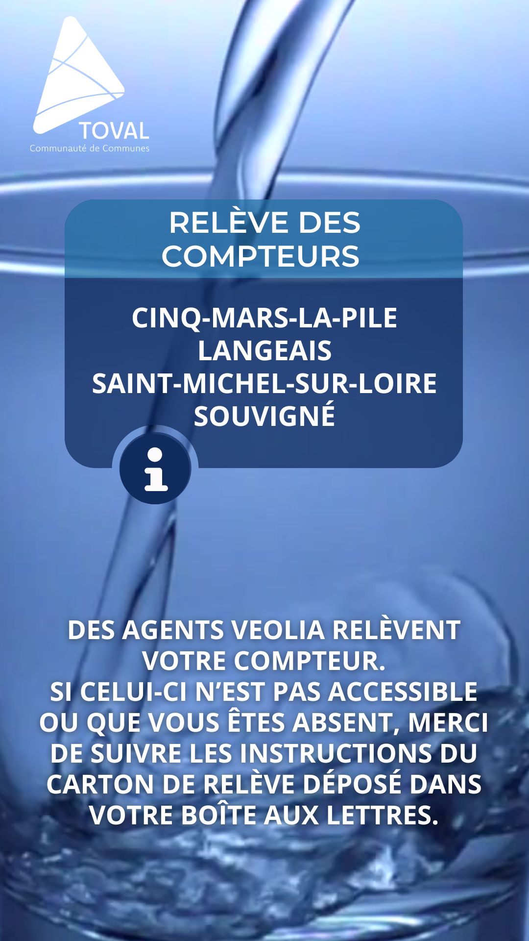 La campagne de relève des compteurs eau potable va débuter sur les communes respectives : Cinq-Mars la Pile, Langeais, Coteaux Sur Loire (secteur Ex St-Michel), Souvigné.